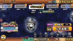 前のステージ宇宙編 二章 ティターン出撃制限:1200円以上のキャラのみ一段目:大狂乱のネコ島lv40、ネコ医師lv31+6、ネコ島lv20+37、べべlv30+2、ねこ仙人lv30二段目:ネコジャラミlv20+31、大狂乱のネコジャラミl...